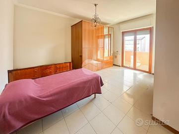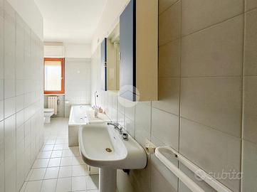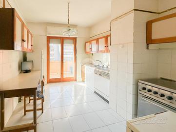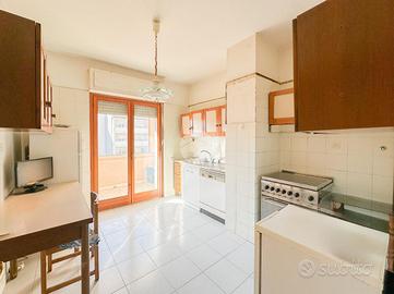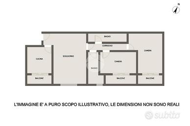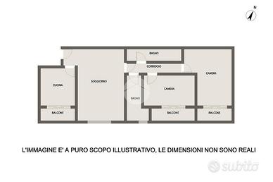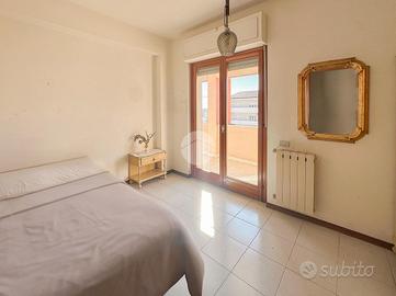 Entrando ci accoglie direttamente un ampio e luminoso soggiorno e una cucina abitabile con uscita su un balcone; un disimpegno ci conduce invece nella zona notte, dove troviamo due camere con balcone condiviso, una matrimoniale e una singola, infine due bagni, di cui uno finestrato.