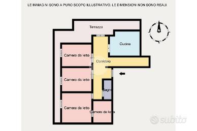 La soluzione è così composta: un ampio ingresso ci accoglie direttamente nella zona giorno, dove abbiamo una luminosa cucina abitabile, con uscita sul terrazzo esclusivo di 40 mq, ed un soggiorno, attualmente adibito a terza camera, anch'esso con uscita sul terrazzo.
