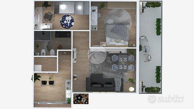 L'ingresso accompagna in un soggiorno open space accogliente e luminoso, uno spazio centrale dove vivere i momenti quotidiani con naturalezza. La cucina abitabile rende ogni giornata più organizzata, mentre la zona notte, composta da due camere, offre tranquillità e la giusta privacy, perfetta anche per una giovane coppia con bambini.