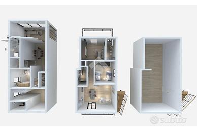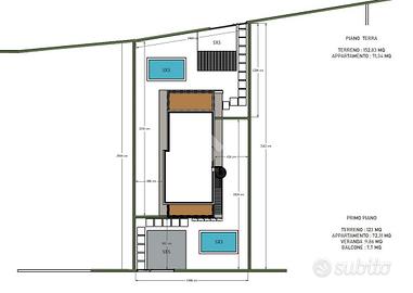 - al PRIMO PIANO troviamo cucina-soggiorno con balcone, due bagni e due camere di cui una con terrazzo. Inoltre, l'appartamento dispone di un ulteriore terrazzo calpestabile di 70 metri quadrati situato al secondo piano e di giardino ad uso esclusivo.