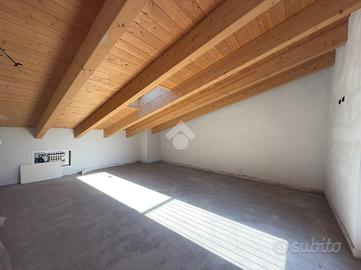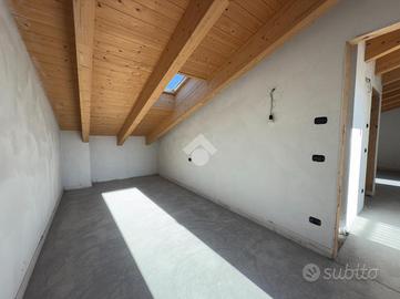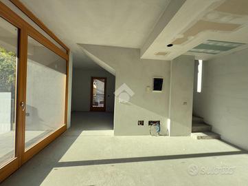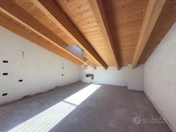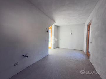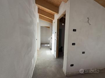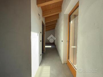 L'ingresso si apre sulla luminosa zona giorno, composta da un ampio soggiorno con accesso diretto al terrazzo abitabile, una cucina separata e un bagno finestrato. Una scala interna conduce al piano superiore dove si trovano due camere da letto, entrambe con uscita sul balcone, e un secondo bagno.