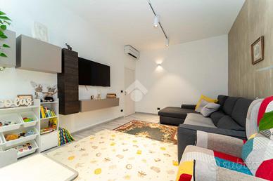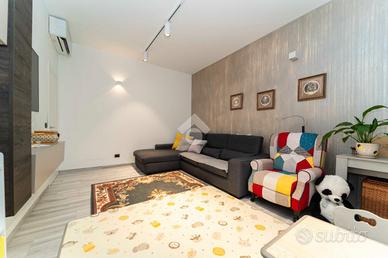 L'ingresso si apre su un disimpegno che distribuisce in modo funzionale i vari ambienti. La zona giorno, con angolo cottura, è resa luminosa grazie alla presenza di una finestra e di un balcone con affaccio su interno cortile. Il soggiorno, ampio e accogliente, gode di grande luminosità e affaccia sull'area verde del condominio. È dotato di impianto di climatizzazione e faretti regolabili che donano un tocco moderno e raffinato all'ambiente.