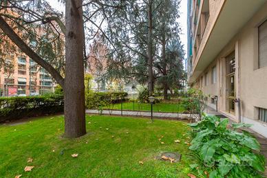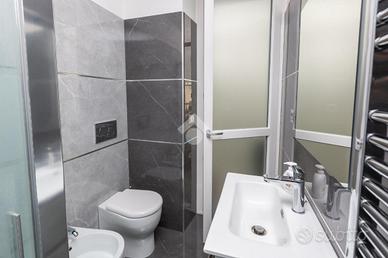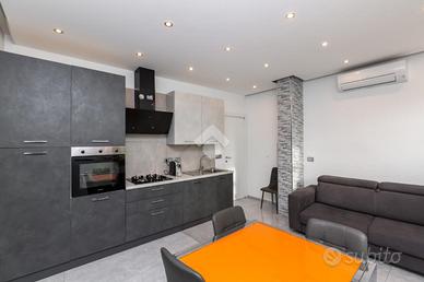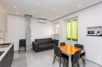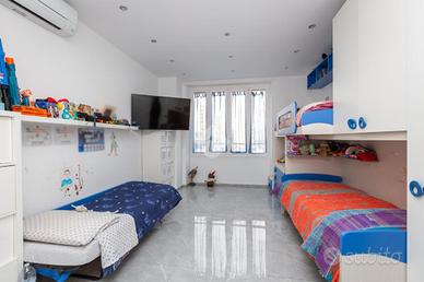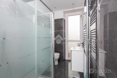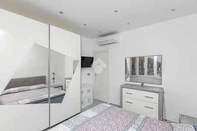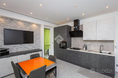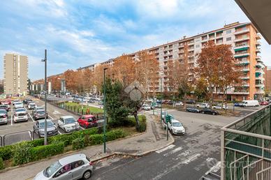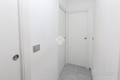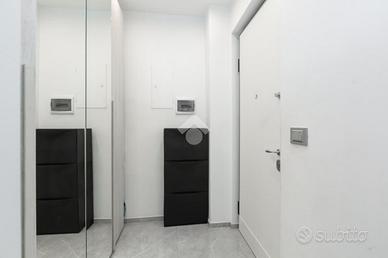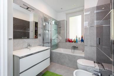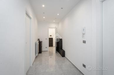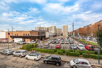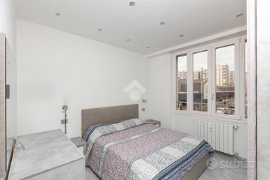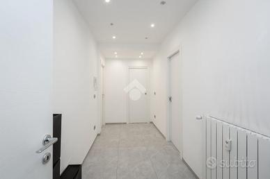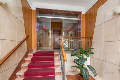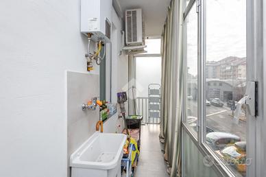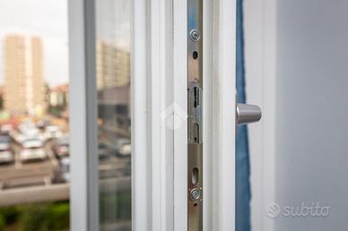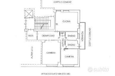 L'appartamento è al primo piano, raggiungibile tramite ascensore, in un complesso decoroso rientrato dalla strada grazie al giardino condominiale. L'immobile gode di una tripla esposizione. Internamente è stato completamente e finemente ristrutturato e si sviluppa su una metratura generosa, caratteristica che rende vivibile al meglio ogni singolo vano. L'accesso avviene tramite un portoncino blindato che si affaccia sull'ingresso il quale ci accompagna su ampio disimpegno che divide in modo ottimale tutti i vani dell'immobile. La zona giorno è un ambiente ampio e confortevole. Date le dimensioni ci permette di avere una cucina lineare, con un tavolo quadrato centrato rispetto alla stanza, ed una parete dedicata alla tv con difronte un comodo divano. L'affaccio è lato cortile, grazie alle finestre e all'accesso ad un ampio balcone verandato. Le camere da letto sono due, entrambe dotate di tutti i comfort e con affaccio su via Stelvio fronte Carrefour. L'appartamento ha i doppi servizi. Il primo con vasca e finestra. Il secondo con doccia e porta finestra che dà sul balcone interno. Adiacente al primo servizio troviamo un ripostiglio attualmente utilizzato come lavanderia. Cucina e camere sono munite di climatizzatore. Tutti gli infissi esterni sono in pvc e le tapparelle elettriche. La proprietà dispone di una cantina al piano interrato. Il teleriscaldamento è il sistema di riscaldamento presente nel condominio.