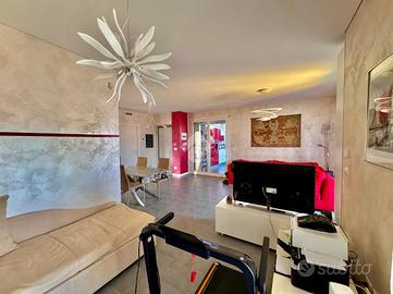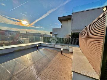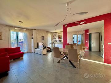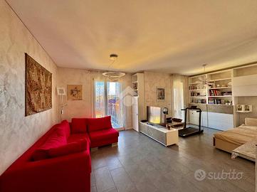 Situato all'ultimo piano, l'appartamento è composto da ingresso living su un grande salone doppio, dotato di due porte finestre, una con balcone alla francese, l'altra invece dà l'accesso al primo terrazzino con affaccio sul giardino condominiale, che offre un'ottima luminosità all'appartamento stesso.