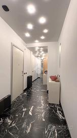 Tutti gli infissi sono in legno con doppio vetro, garantendo un ottimo isolamento termico e acustico, ad eccezione del bagno dove sono in PVC. Il corridoio è stato ribassato con l'installazione di moderni faretti a incasso, che assicurano un'illuminazione diffusa ed elegante.