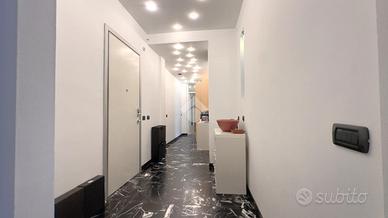 La zona notte è impreziosita da un pregiato gres porcellanato effetto legno, che dona calore e stile agli ambienti, mentre nel corridoio e nel salone è stato mantenuto il marmo originale d'epoca, perfettamente conservato e valorizzato.