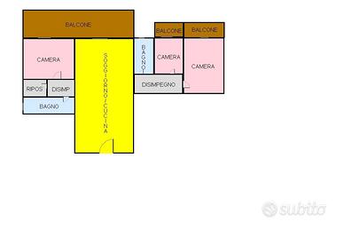 L'appartamento è composto da: ingresso in cucina-soggiorno, tre camere da letto, doppio servizio e ripostiglio.