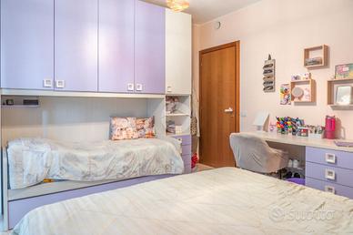 Tramite il disimpegno si accede alla zona notte, la quale comprende due camere da letto, di cui una matrimoniale con accesso al proprio balcone privato ed un bagno finestrato completo di box doccia e vasca.