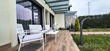Nella zona più rchiesta del paese, proponiamo appartamento con giardino privato, di recente costruzione, posto al piano terra con ingresso indipendente. L'interno si compone di ampia zona giorno con angolo cottura, 2 comode camere da letto e bagno con doccia tutto rifinito con materiali di ottima fattura. La comodità è garantita da un interrato collegato direttamente, che include la taverna ed una pratica lavanderia. Il box auto doppio in larghezza offre ampio spazio per il parcheggio. L'immobile è dotato di un sistema di ventilazione meccanica controllata (VMC) e di un moderno impianto di riscaldamento e raffreddamento a pavimento, assicurando un ambiente confortevole in ogni stagione. Questa soluzione abitativa rappresenta un'opportunità unica per chi cerca una casa moderna e funzionale in una posizione strategica.