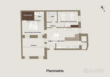 L'alloggio ha una spaziosa zona giorno con angolo cottura e con accesso al terrazzino. Questo ambiente ha inoltre una pratica dispensa nelle adiacenze dell'angolo cottura. La zona notte è composta da una camera matrimoniale con bagno privato e cabina armadio e una camera doppia dove nelle vicinanze è sitato un bagno completo cieco e attacco per la lavatrice.