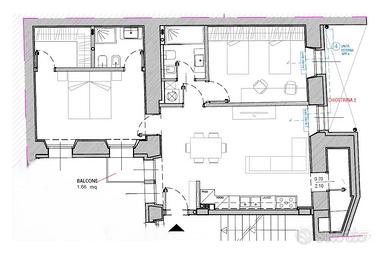 L'alloggio ha una spaziosa zona giorno con angolo cottura e con accesso al balcone. Questo ambiente ha inoltre una pratica dispensa nelle adiacenze dell'angolo cottura. La zona notte è composta da una camera matrimoniale con bagno privato e cabina armadio e una camera doppia dove nelle vicinanze è situato un bagno completo e un comodo attacco per la lavatrice.