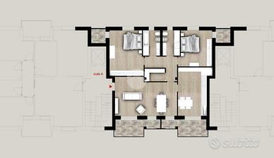 Trilocale situato al piano primo su unico livello abitativo con ampi spazi interni, zona giorno con salotto e area pranzo con uscita sul primo sfogo esterno, cucina separata con accesso all'altro balcone, zona notte composta da due camere da letto spaziose, due bagni e locale ripostiglio.
