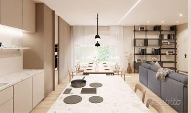 L'appartamento, di circa 130 mq, si distingue per l'ingresso indipendente e per gli spazi ampi e ben distribuiti. La zona living è composta da un luminoso soggiorno con cucina open space di oltre 35 mq, caratterizzata da un'ampia vetrata che conduce direttamente al giardino privato.