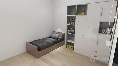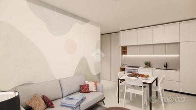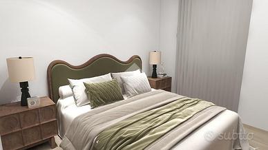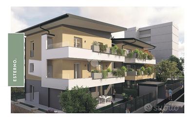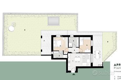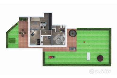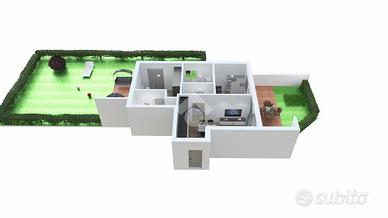 La soluzione con design moderno è composta dal soggiorno con cucina a vista, dalla camera matrimoniale, dai doppi servizi, e dal giardino privato di 156 mq oltre ad portico di 30 mq.