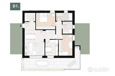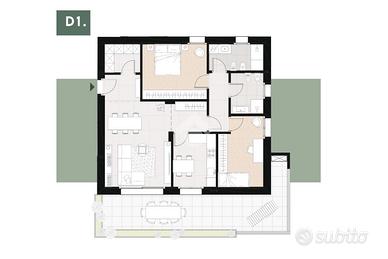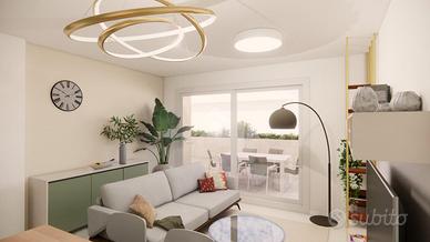La soluzione con design moderno è sita al primo piano ed è composta dal soggiorno, dalla cucina abitabile, da due camere da letto, dal ripostiglio, da due bagni entrambi finestrati e dal terrazzo privato di 33 mq.