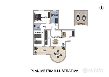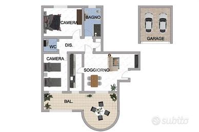 La zona notte comprende due camere da letto, perfette per una famiglia o per chi desidera uno spazio aggiuntivo per ospiti. Sono presenti due bagni, un ripostiglio e un comodo soppalco che aggiunge ulteriore spazio per l'organizzazione domestica. Completa la proprietà un garage di 30 mq.