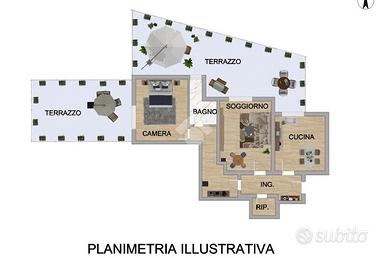 L'immobile si compone di: cucina abitabile, spaziosa e funzionale, zona giorno luminosa con accesso diretto a un ampio terrazzo, perfetto per momenti di relax o convivialità all'aperto, ripostiglio, camera da letto con uscita su secondo terrazzo privato e un bagno finestrato.