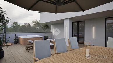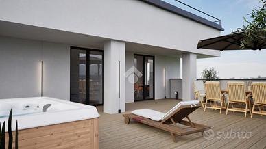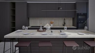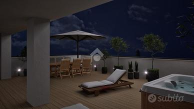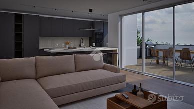 Zona giorno open space con cucina a vista, due camere da letto:la matrimoniale con bagno en suite e accesso al terrazzo, la seconda con balcone. Infine troviamo il secondo bagno.