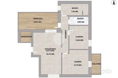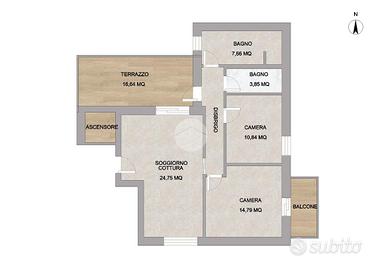Soggiorno con angolo cottura - due camere da letto - due bagni - terrazzo - balcone - cantina - posto auto coperto.