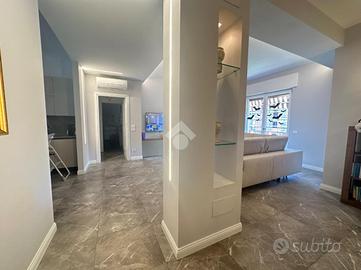 Internamente la distribuzione è stata modificata con la ristrtturazione e troviamo: ampio e luminoso soggiorno con accesso al balcone immerso nel verde, perfetto per momenti di relax. La cucina a vista con zona pranzo si apre su un secondo balcone, attrezzato come vano lavanderia. La zona notte ospita due spaziose camere matrimoniali, di cui una con cabina armadio arredata su misura e un servizio finestrato con moderno box doccia.