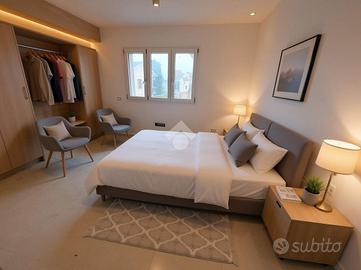 Zona giorno open-space con cucina a vista, due camere da letto, due bagni e ripostiglio.