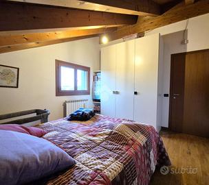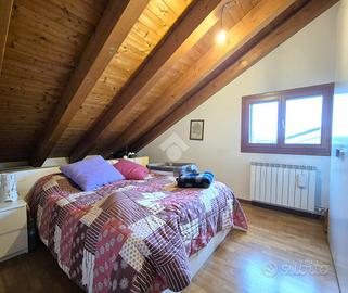 Il reparto notte, caratterizzato dalle travature tipiche del mansardato, ospita due camere da letto, una matrimoniale ed una singola, ed un bagno finestrato con vasca.