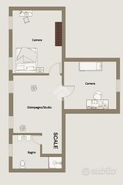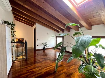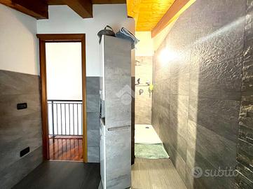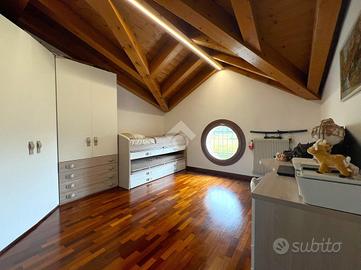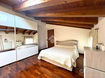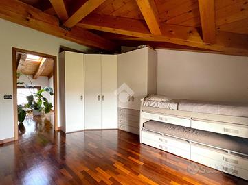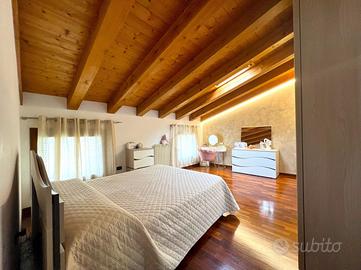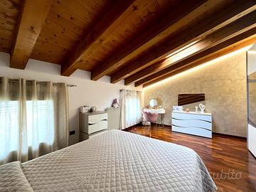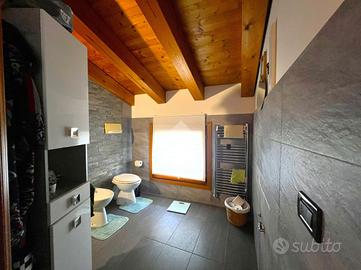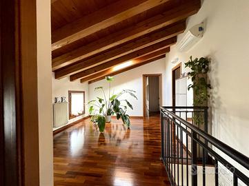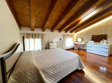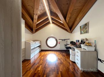 Salendo al piano superiore si viene accolti da un ampio spazio openspace, ideale come zona relax, studio o area hobby, che distribuisce l'accesso alle due camere matrimoniali, entrambe caratterizzate da soffitti con travi a vista. Completa il piano un secondo bagno finestrato, dotato di doccia.