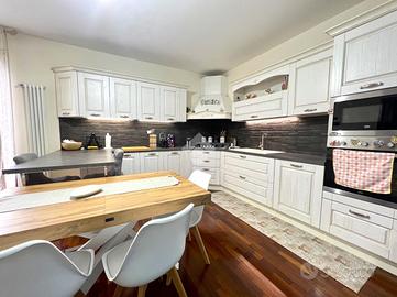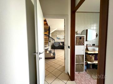 L'ingresso conduce direttamente al soggiorno, dove troviamo la scala a vista che porta al piano superiore. Sempre al primo livello, separata da un disimpegno, si trova una cucina abitabile di generose dimensioni e un bagno finestrato con vasca.