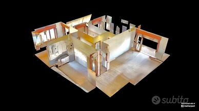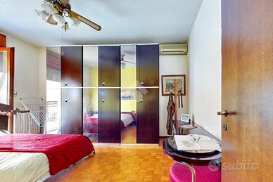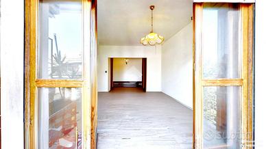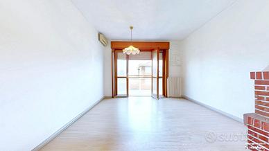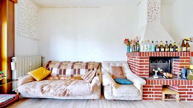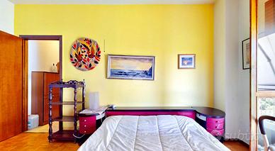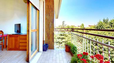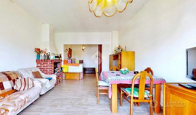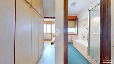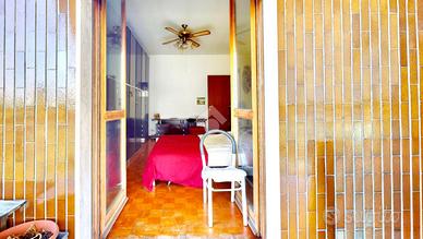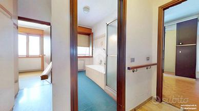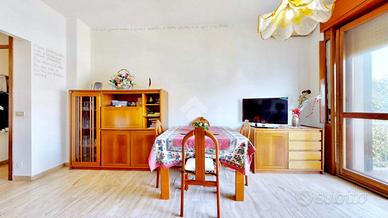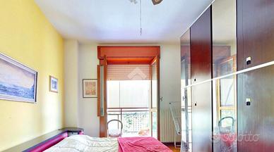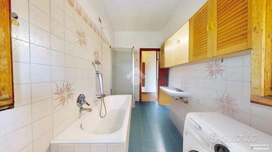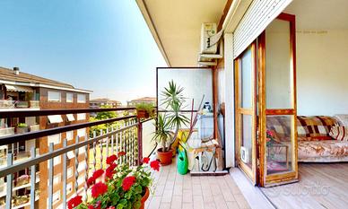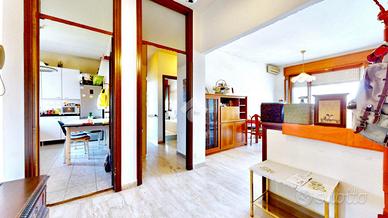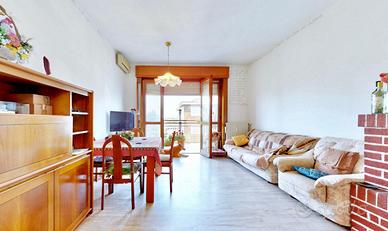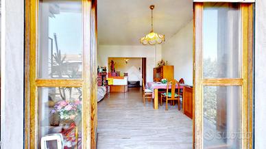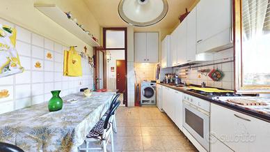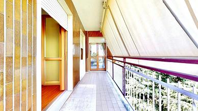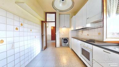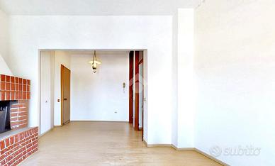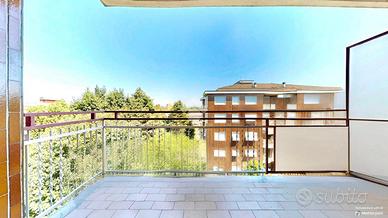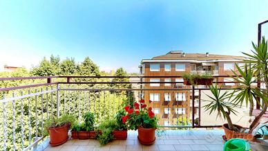L'appartamento è composto da un ampio ingresso che porta nel soggiorno ampio (dotato di camino) e accesso su bacone con esposizione sul verde, cucina abitabile, disimpegno che porta nella zona notte, in cui troviamo una camera matrimoniale, camera singola (entrambe collegate da un secondo balcone) e bagno dotato sia con vasca e doccia. L'appartamento ha una tripla esposizione libera su tre lati.