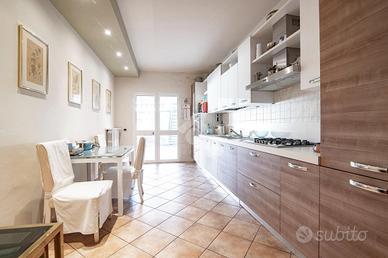 La zona porticata aggiunge un ulteriore spazio esterno coperto, utile per pranzi all'aperto o come area relax. L'appartamento dispone inoltre di un box auto, garantendo comodità e sicurezza per il parcheggio