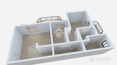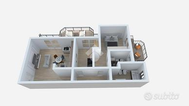 Ad accoglierci troviamo la zona giorno che si apre su un ampio soggiorno con cucina a vista avente accesso diretto a uno dei due terrazzi. Proseguendo vi troviamo due camere da letto, entrambe con uscita su terrazzo, la camera padronale offre un bagno in camera con box doccia e finestra.