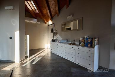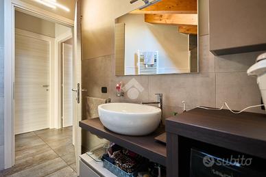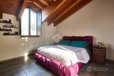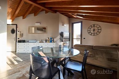 In centro paese, tutti i servizi sono comodamente raggiungibili a piedi, appena sotto casa sono presenti bar e altre attività commerciali, fermata dell'autobus, un parchetto e il supermercato poco più avanti. La palazzina è stata costruita nel 2010 e l'appartamento si trova al secondo ed ultimo piano, quindi ha il soffitto in legno con travi a vista e un terrazzino di 15 mq con affaccio su un'area verde, quindi molto tranquillo. L'ingresso è nella zona living, ampia e molto luminosa, con spazi ben distribuiti tra la zona da pranzo con cucina a vista e la zona relax con divano e tv. Dalla zona giorno un disimpegno accompagna alle camere da letto ed al bagno. Le camere sono due, una matrimoniale ed una singola, il bagno ha il lucernario e una doccia con piatto doppio. Trattandosi di un appartamento di costruzione recente è dotato di riscaldamento a pavimento, serramenti con doppi vetri e predisposizione per l'impianto di aria condizionata, caratteristiche che lo classificano come appartamento ad alta efficienza energetica e che quindi può essere acquistato con l'ausilio di 'mutuo green', ovvero a tasso agevolato. Questa soluzione abitativa viene venduta completa di cucina, arredo bagno e mobile della cameretta. Completa la proprietà il box auto doppio di 25 mq.