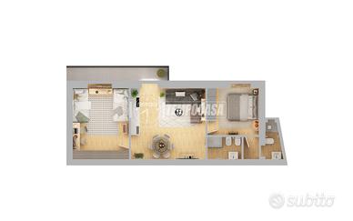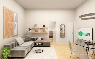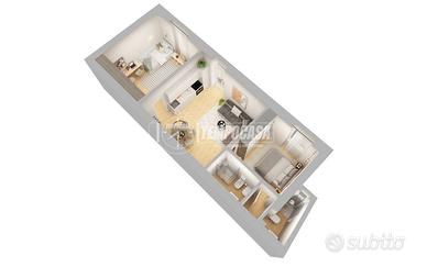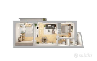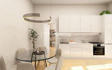 Come rappresentato dal progetto rendering allegato, l'immobile si apre su un'ampia zona living climatizzata con cucina a vista. La camera matrimoniale esistente affaccia sull'interno del cortile, una disposizione perfetta per vivere la zona notte in tutta tranquillità. Il render prevede anche la realizzazione di una seconda camera singola e di due bagni.