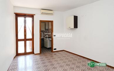 Il soggiorno, accogliente e luminoso, è dotato di un funzionale cucinino e vanta un accesso diretto al balcone.