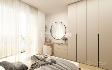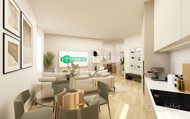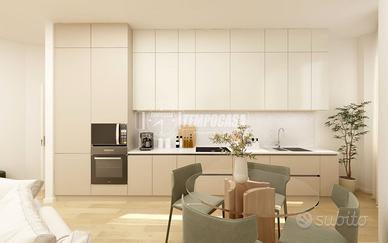 L'appartamento si apre su un disimpegno che conduce direttamente alla luminosa zona giorno con cucina a vista. La zona notte è composta da una camera matrimoniale e una camera singola, entrambe con accesso ai rispettivi balconi.