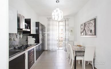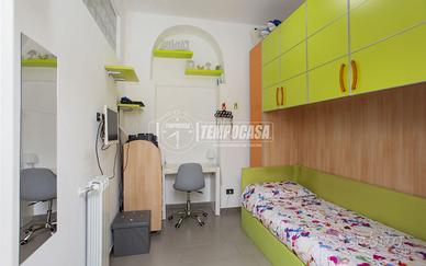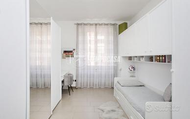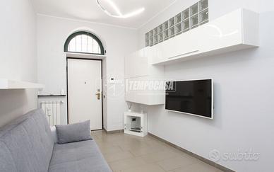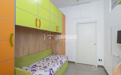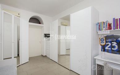 L'appartamento è così composto: Ingresso su piccola zona living, cucina abitabile con balcone con vista panoramica su piazza Gramsci e via Canonica, camera da letto singola, disimpegno con ripostiglio in quota, ampio bagno finestrato con box doccia e sanitari appoggiati, secondo camera da letto matrimoniale. L'appartamento presenta le seguenti finiture:
