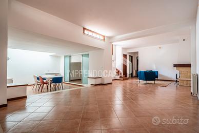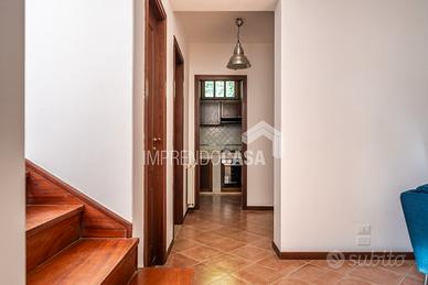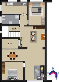 La casa è composta da: ingresso su ampia zona living con camino, distribuita tra zona relax, zona pranzo e zona salone, cucina, 2 camere da letto, servizio, ripostiglio. Peg.