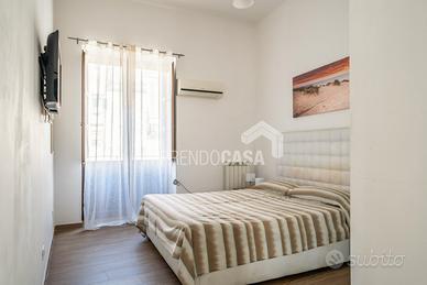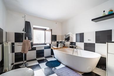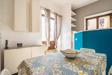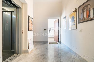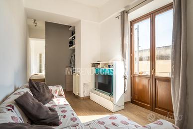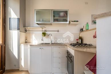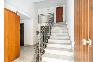 Composto da: Ingresso su zona giorno con angolo cottura, camera da letto, cameretta, servizio, armadio a muro, scala interna che porta ad una stanza da bagno finestrata con vasca e pavimentazione in ceramica a scacchi bianca e nera, 5 balconi!
