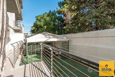 L'ingresso dell'appartamento conduce direttamente in un ampio soggiorno, il quale dispone di un comodo balcone che si affaccia sul prospetto principale del residence. Accanto al salone troviamo una cucina abitabile con accesso a un secondo balcone, da qui si apre un meraviglioso terrazzo di 30 mq circa che arricchisce lo spazio abitativo con un'ulteriore area esterna.