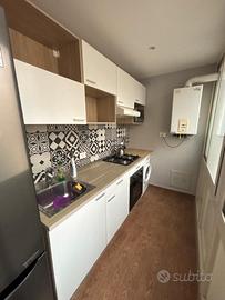 Cucina completa di tutti gli elettrodomestici: piano cottura, forno, frigorifero, microonde e lavatrice.