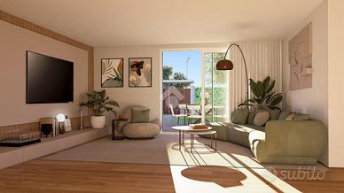 Piano terra composto da ingresso, zona giorno open space con cucina e soggiorno, tre camere da letto, due bagni e giardino privato di oltre 320mq.