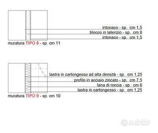 Caratteristiche: cappotto di 14cm, tipologia di muratura adatta ad ogni parete, fornitura/posa pannelli in stiferite tra le pareti divisori degli appartamenti, fortinura/posa porte tamburate lisce e laccate, porte scorrevoli in legno laccato bianco, serramenti pvc scorrevoli ove previsto, davanzali in travertino chiaro rapolano, serramenti pvc con prestazioni termico-acustico idonee, isolamento termico-acustico, lato superiore della terrazza di 10cm, parapetti in cristallo.