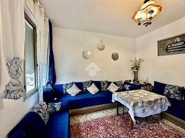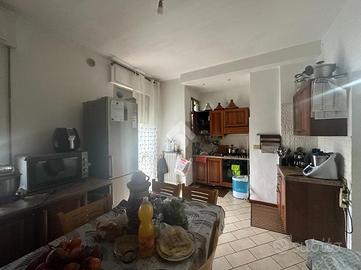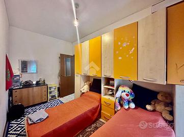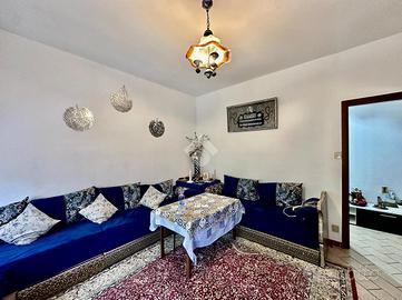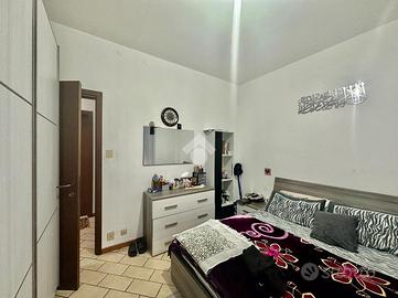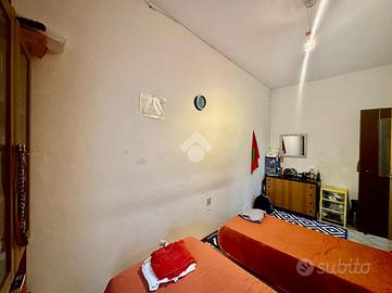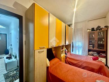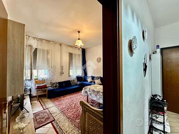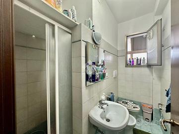 Rispetto all'ingresso, percorrendo il corridoio principale, a sinistra troviamo il soggiorno con angolo cottura con accesso diretto al terrazzo di riferimento, esposto a est; proseguendo incontriamo il bagno finestrato con doccia e la prima camera da letto doppia.
