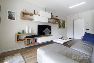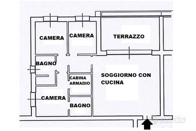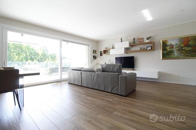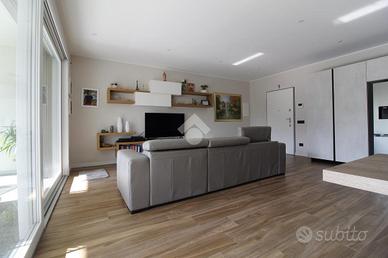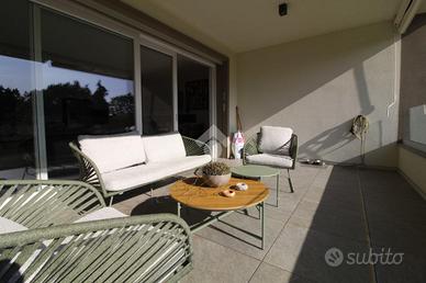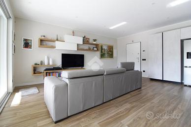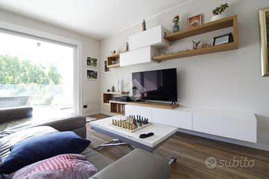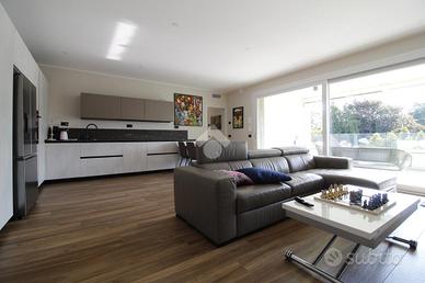 Entrando in casa ci accoglie l'ampio soggiorno che integra la cucina. Questo ambiente è tanto grande da riuscire ad ospitare sia la zona giorno sia la zona pranzo. La grande porta finestra presente in soggiorno permette l'accesso al terrazzo di circa 20 metri quadrati, perfetto per passare tempo all'aperto, anche grazie alla presenza delle tende motorizzate che garantiscono riparo dal sole. Il terrazzo è anche dotato di una fioriera e di un rubinetto dell'acqua.