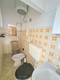 Secondo piano: accogliente camera da letto e bagno con doccia, con pavimento in ceramica e finestra in legno.