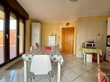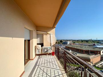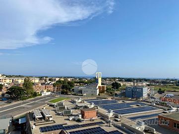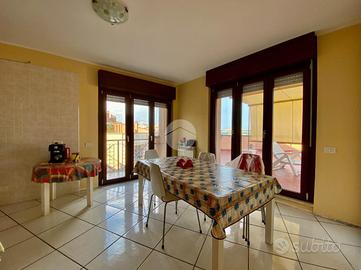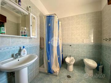 L'attico si apre su un ampio e luminoso salone con camino, perfetto per accogliere momenti di relax o convivialità. La cucina è abitabile e dispone di un comodo balcone, mentre il salone affaccia su un grande terrazzo con vista mare, ideale per cene all'aperto. La zona notte si compone di due camere da letto e un bagno finestrato con box doccia.