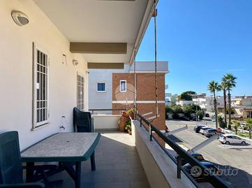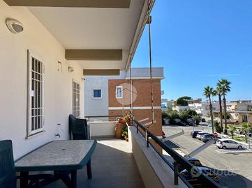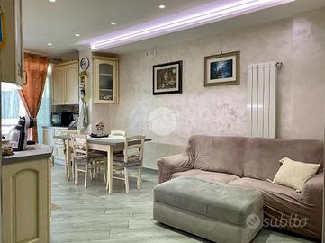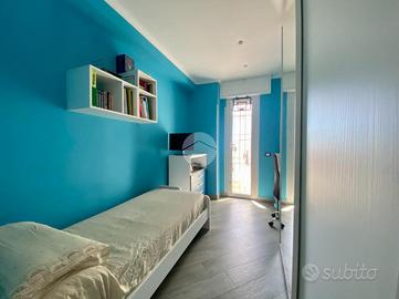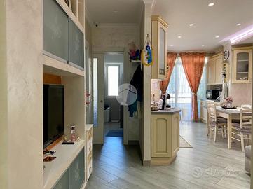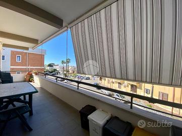 La casa si apre su un pratico ingresso con ripostiglio e conduce all'ampia zona giorno con angolo cottura, luminosa e accogliente, dalla quale si accede al terrazzo esterno coperto da tende da sole, perfetto per i momenti di relax e dal quale si può ammirare anche uno scorcio di mare. La zona notte è composta da due camere matrimoniali, di cui una con bagno privato completo di box doccia, una cameretta e un secondo bagno finestrato con doccia. Una delle camere matrimoniali e la cameretta affacciano su un terrazzino che è stato chiuso con una serra bioclimatica a vetrate, ideale da utilizzare tutto l'anno e attrezzato con zona lavanderia. L'appartamento è dotato di ogni comfort: impianto di climatizzazione caldo/freddo, riscaldamento autonomo a metano, infissi in PVC con doppio vetro e grate di sicurezza su tutte le finestre.