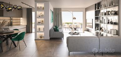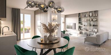 * ingresso su luminoso soggiorno con cucina a vista, con accesso diretto al terrazzo di 17mq, perfetto per pranzi all'aperto e momenti di relax;