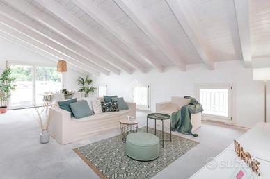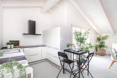 L'accesso diretto tramite ascensore interno aggiunge un tocco di esclusività a questa proprietà. Una volta dentro, sarete accolti da uno spazio abitativo luminoso e spazioso, caratterizzato da soffitti mansardati con travi a vista.