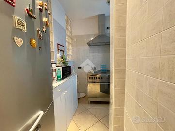 L'ingresso si apre su un ampio soggiorno, un ambiente accogliente e luminoso ideale per momenti di relax o convivialità. Sulla destra si trova la cucina abitabile, illuminata da un balcone con affaccio interno. Qui, oltre ad un comodo secondo ingresso, è presente un cucinino ed un bagno di servizio, che assicurano massima praticità nella gestione quotidiana degli spazi.